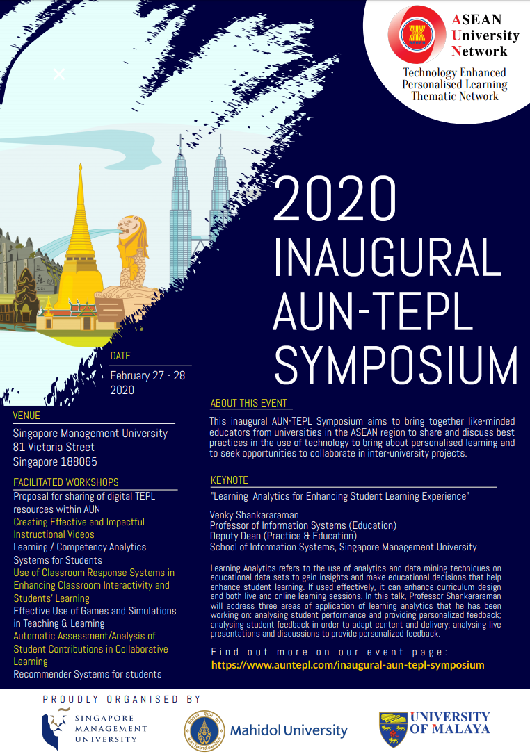 On behalf of Singapore Management University (SMU) and co-leading universities - Mahidol University (MU) and University of Malaya (UM), we would like to extend a warm invitation to you to attend the Inaugural AUN-TEPL Symposium on 27-28 February 2020 at Singapore Management University. We are expecting around 100 faculty members and academic staff across the ASEAN countries for this event where we will share best practices in the use of technology to bring about personalised learning. We hope to explore ideas and seek opportunities to collaborate in inter-university projects. Details of the event are appended below and at this link.
