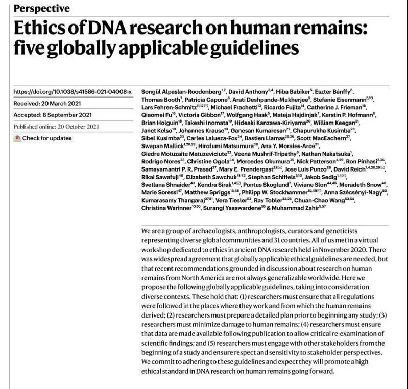 On 20 October 2021, Ethics of DNA Research on Human Remains: Five Globally Applicable Guidelines was published in Nature. Wang Chuanchao, professor of School Sociology and Anthropology and School of Life Sciences of Xiamen University (XMU), helped draft the guideline with other 64 co-authors from 31 countries. The research pointed out the problems in the existed ‘North American Guidelines’ and proposed new globally applicable guidelines. Meanwhile, 24-language translations were attached by Nature, wherein the Chinese version was translated by the postgraduate of XMU Liu Yilan and Yang Wenjiao, professor Wang Chuanchao and Wang Qiaomei, member of Institute of Vertebrate Paleontology and Paleoanthropology, Chinese Academy of Sciences.