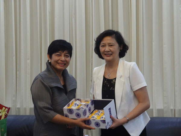 会见中,詹心丽副校长回顾了两校长期以来的紧密合作及皇太后大学孔子学院自成立以来取得的可喜成绩,并对皇太后大学长期以来给予孔子学院的大力支持表示赞赏。在谈到两校有关中医系共建的合作意向时,两位副校长一拍即合,表示将充分利用我校60年的中医海外教学经验,协助皇太后大学中医系的建设,并将积极利用孔子学院资源,将皇太后大学孔子学院打造成一所以中医教学为特色的学院。会见时在座的还有汉语国际推广南方基地\孔子学院办公室主任毛通文、医学院副院长王彦晖等。