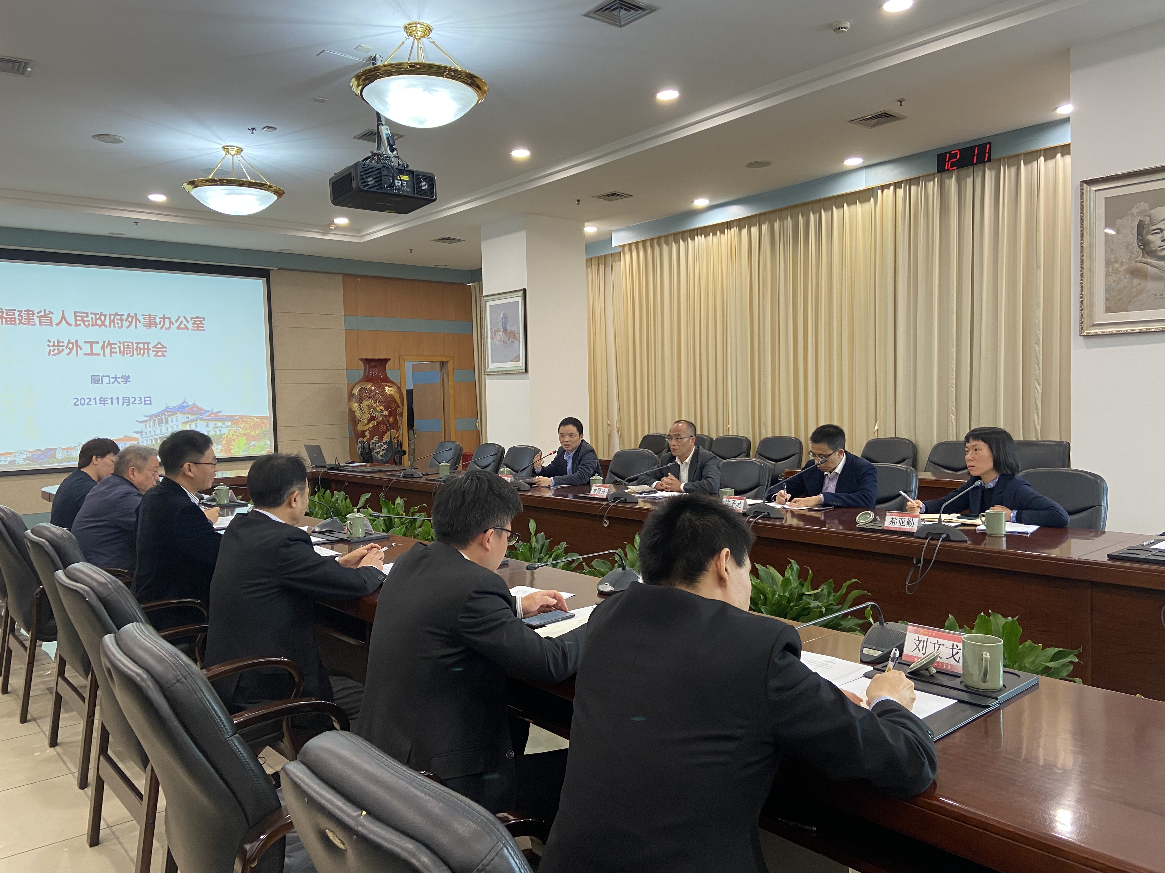蔡舜对调研组一行表示热烈欢迎,并简要汇报了常态化疫情下我校海外师生疫情防控、外国人来华邀请、国际交流与合作、举办国际会议等情况。他表示,在省外办的大力支持下,厦门大学成功举办了百年校庆系列活动,学校各项外事工作进展顺利,非常感谢省外办长期以来对厦门大学的指导与支持。