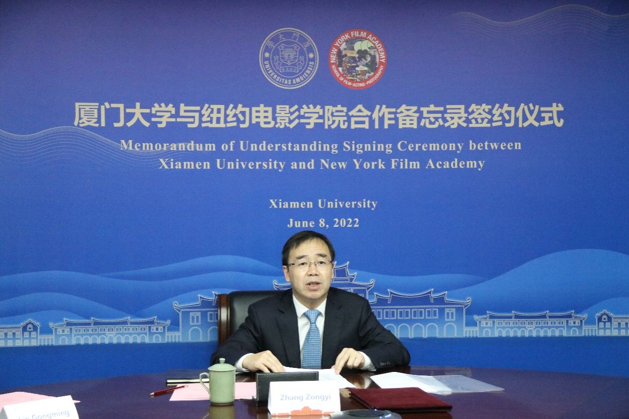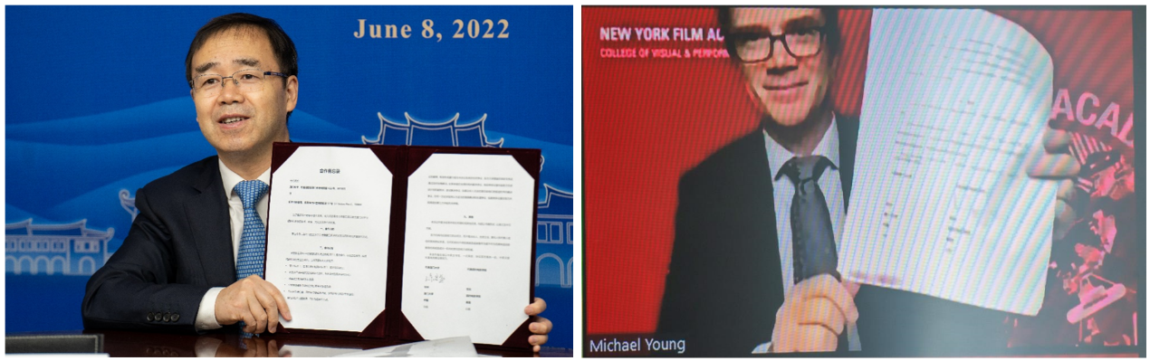 6月8日上午,厦门大学与美国纽约电影学院合作备忘录签约仪式以线上线下相结合的方式举行。校长张宗益,纽约电影学院校长Michael Young、执行副校长朱宇华出席,中华人民共和国驻纽约总领事馆教育参赞杨军见证签约仪式。国际合作与交流处处长蔡舜主持仪式。