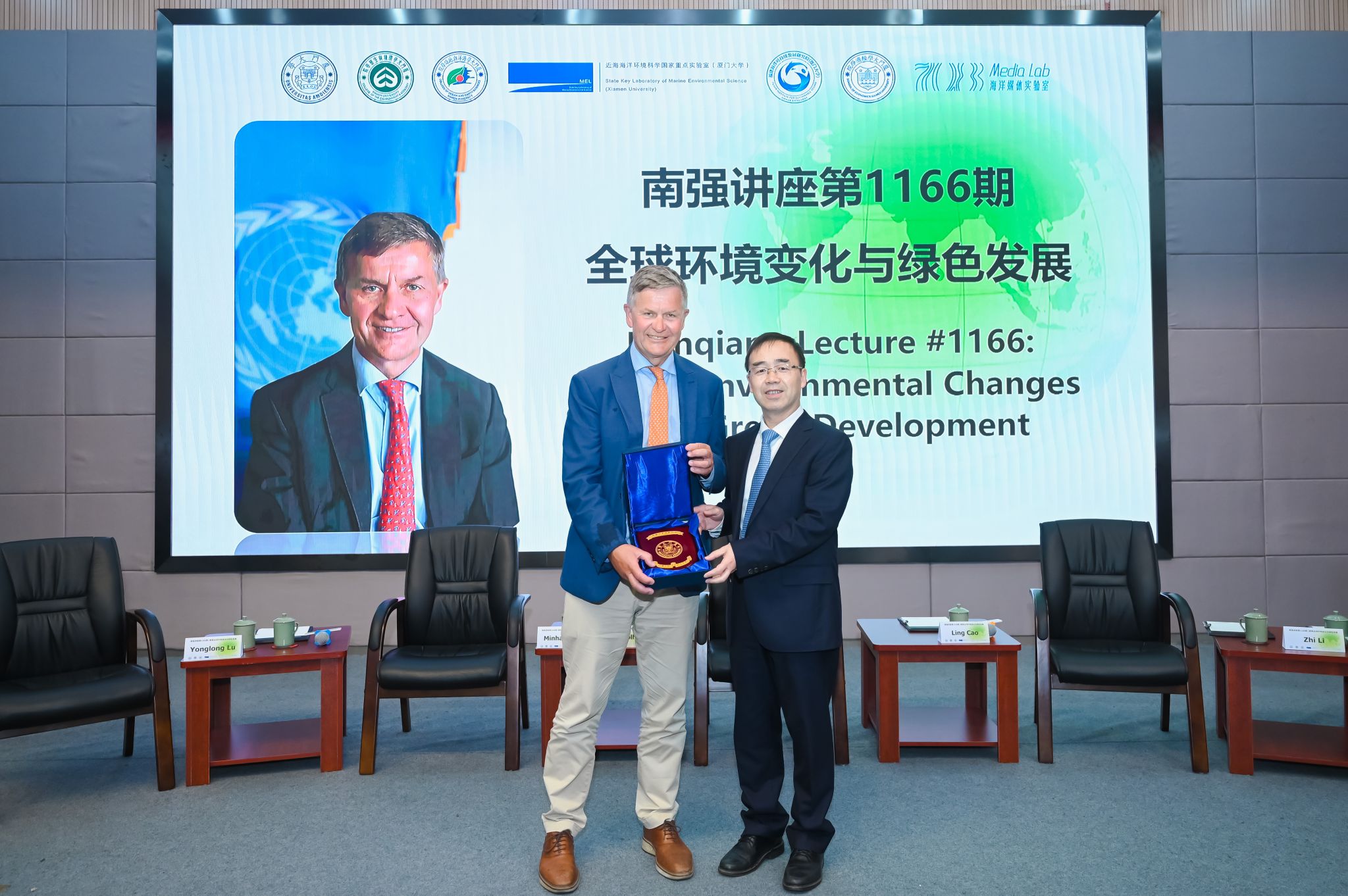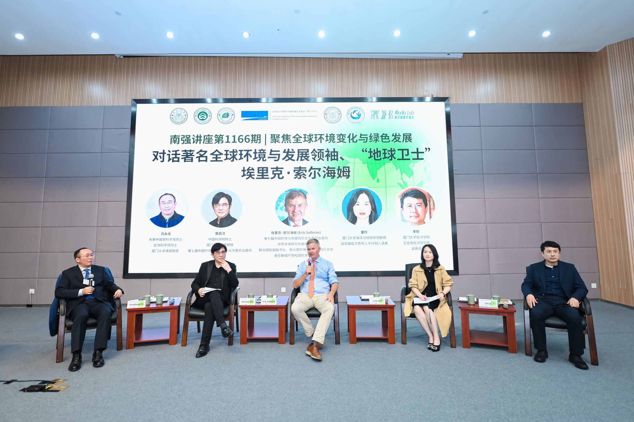 4月12日下午,应中国科学院院士、厦门大学地球科学与技术学部主任戴民汉教授的邀请,著名的全球环境与发展领袖、联合国环境保护领域最高奖——“地球卫士奖”获得者埃里克·索尔海姆(Erik Solheim)先生,在我校翔安校区德旺图书馆二号报告厅为广大师生带来主题为《全球环境变化与绿色发展》的第1166期南强讲座。同时,还邀请了四位专家学者围绕“全球生态环境可持续发展的前景与路径”进行了一场高端对话,并就全球青年人才——尤其是中国青年如何贡献智慧与力量助力全球环境可持续发展进程进行了深入且热烈的讨论。讲座由发展中国家科学院/欧洲科学院/俄罗斯科学院院士、环境与生态学院院长吕永龙教授主持,全校共有200余名师生参加。