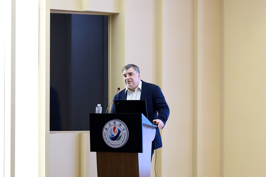 康斯坦丁·诺沃肖洛夫首先回顾了石墨烯的发展历程及其多元化的产业应用现状。他重点介绍了自修复二维材料、自适应智能分离膜以及单原子催化剂方面的最新研究进展,并分享了利用人工智能和机器学习技术加速研发二维材料的创新思路。他预言未来将出现更多二维、三维材料,并发展成为智能性功能性材料。康斯坦丁·诺沃肖洛夫对智能材料的新观点激发了师生观众的强烈兴趣与思想碰撞,现场讨论气氛热烈,问答环节足足持续了45分钟。他还就诸如范德华材料是否是智能材料的最佳平台、人工智能如何助推化学材料领域研究等师生感兴趣的问题进行了回应与解析。