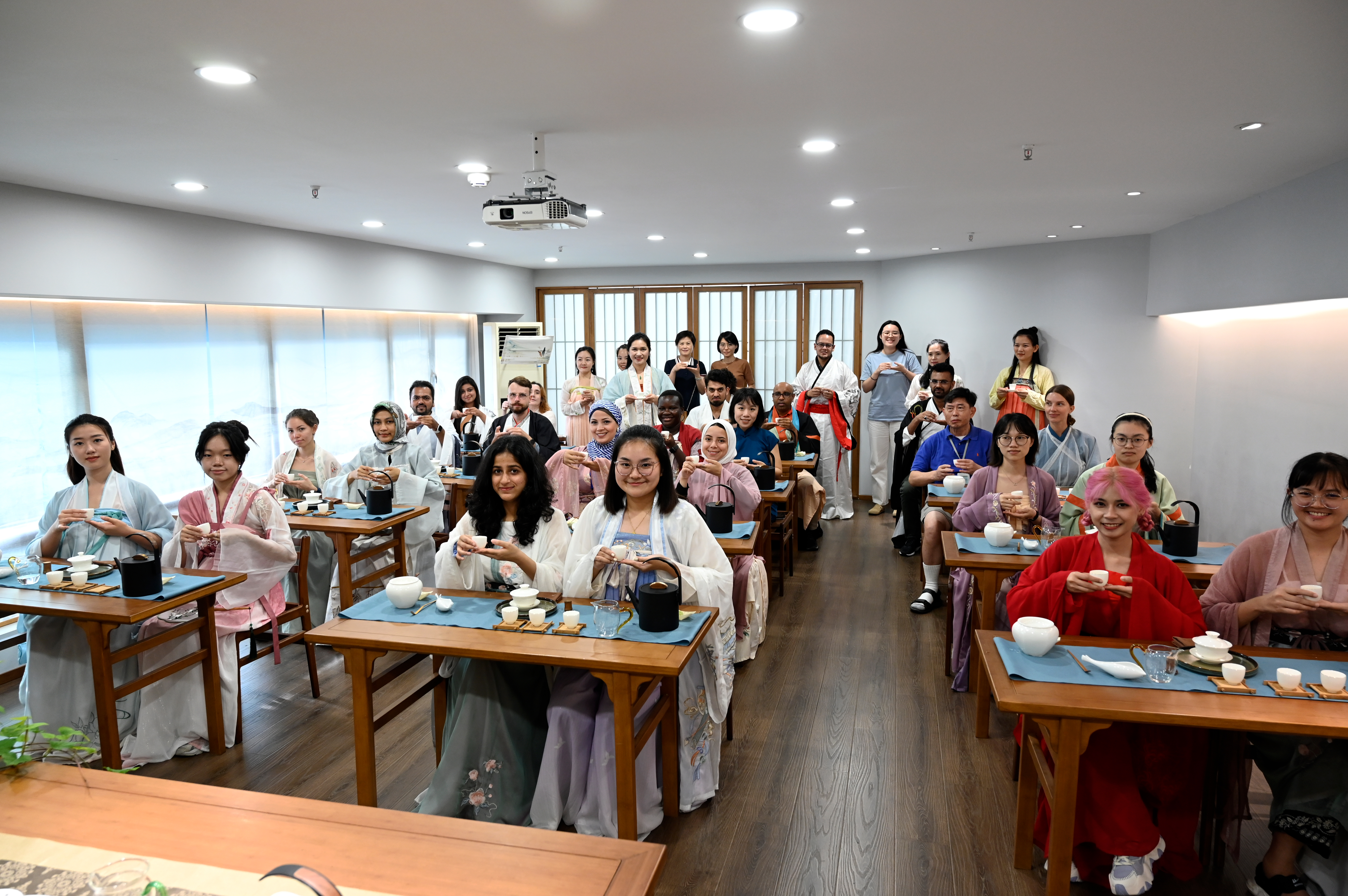 为进一步加强我校外籍师生的沟通交流,增进外籍师生对中国传统文化的认同与喜爱,国际处于7月16日组织近三十位外籍师生体验汉服文化和茶道艺术。
