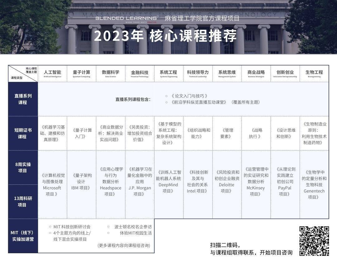 项目将于2023年开设以“科技创新”为主题的线下实践加速营。学生将前往MIT,参与创新研讨会和线下实操锻炼,与MIT顶级教授专家面对面交流,结合前后线上学习,获得MIT官方证书及导师推荐信等成果。