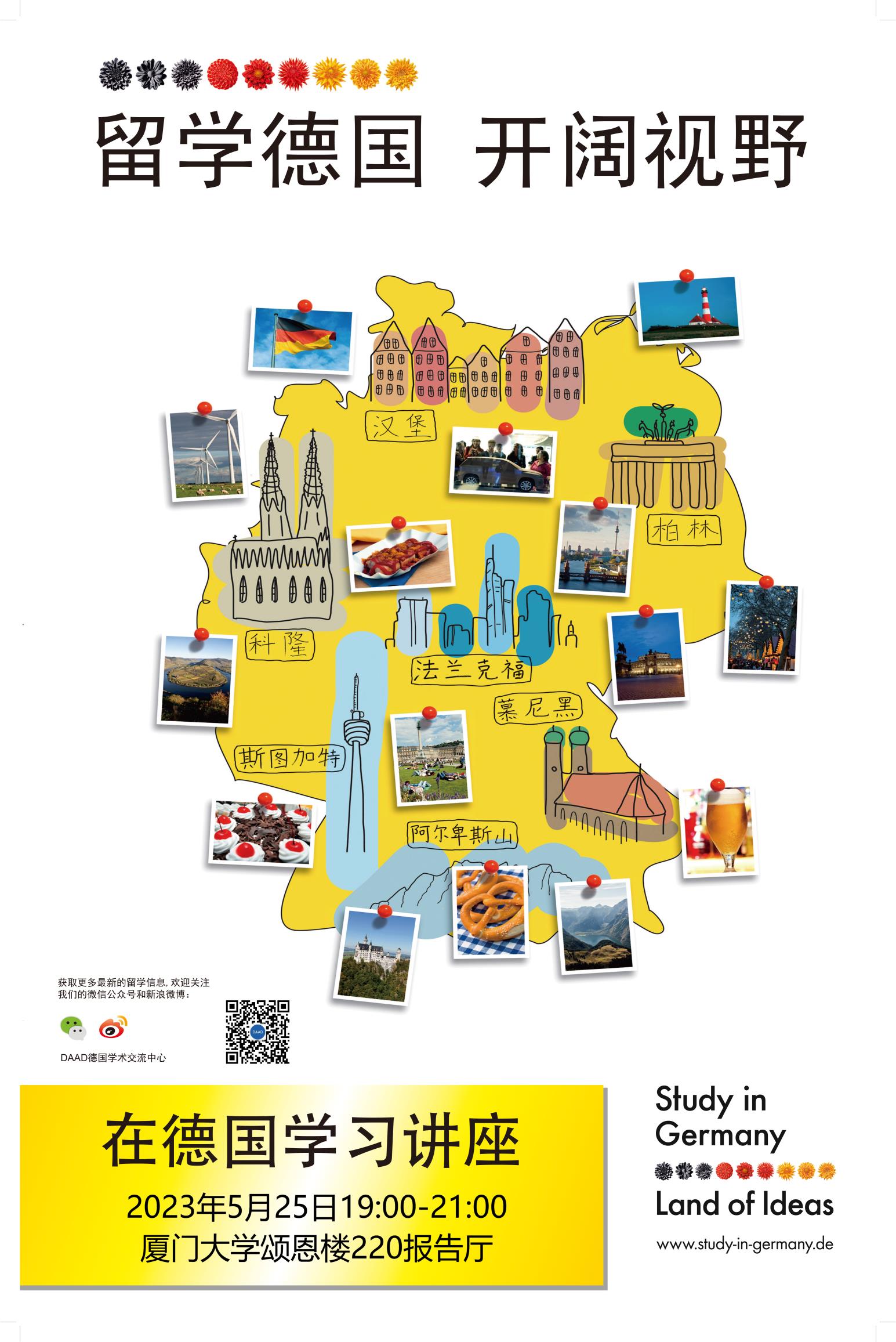 为了帮助我校的学生了解赴德留学与研究的概况和最新资讯,吸引更多的优秀学生到德国留学深造,德国学术交流中心(DAAD)广州代表处将于2023年5月25日(周四)携三所德国高校机构面向我校的学生举办一场以“在德国学习和研究”为主题的宣讲会。德国学术交流中心以及同行的德国高校的老师们将就学生所关心的留学常见问题,如:如何选择学校和专业、留学德国的申请条件和步骤、何时提出申请,以及在德国学习生活的费用、相关的奖学金项目和资助机会等,进行专场讲座并在活动最后提供现场答疑。