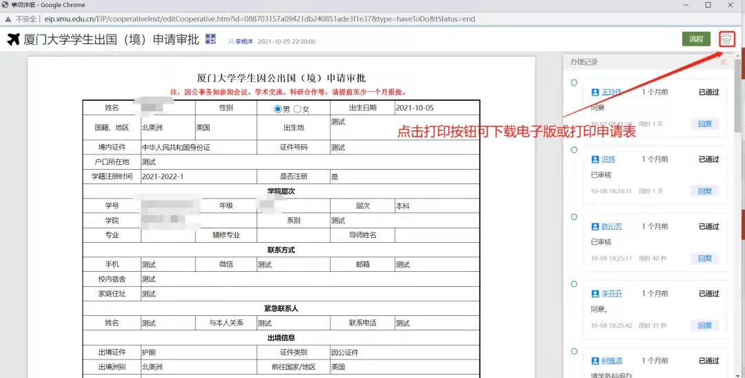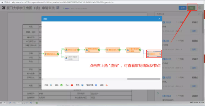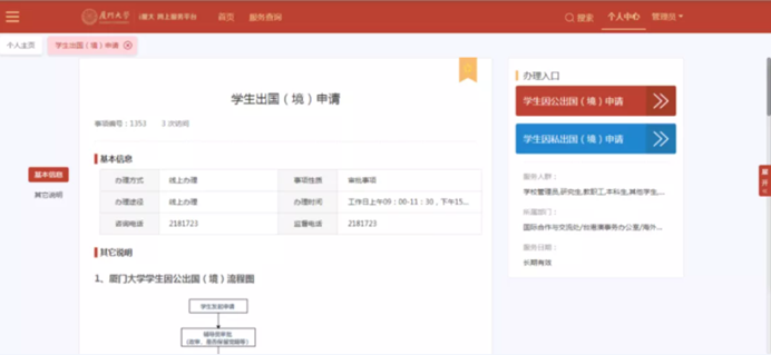 第三步:点击右上角“办理入口”根据“厦门大学学生因公/因私出国(境)申请审批”表单要求填写申请表