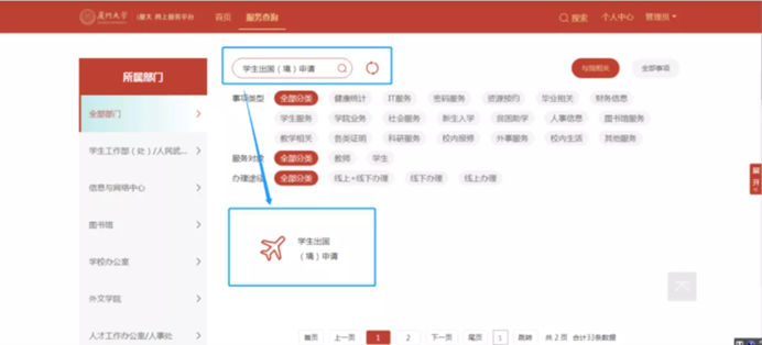 第一步:点击上方“服务查询”板块搜索框输入“学生出国(境)申请”注:建议使用ie、谷歌等浏览器请勿使用微信自带浏览器打开