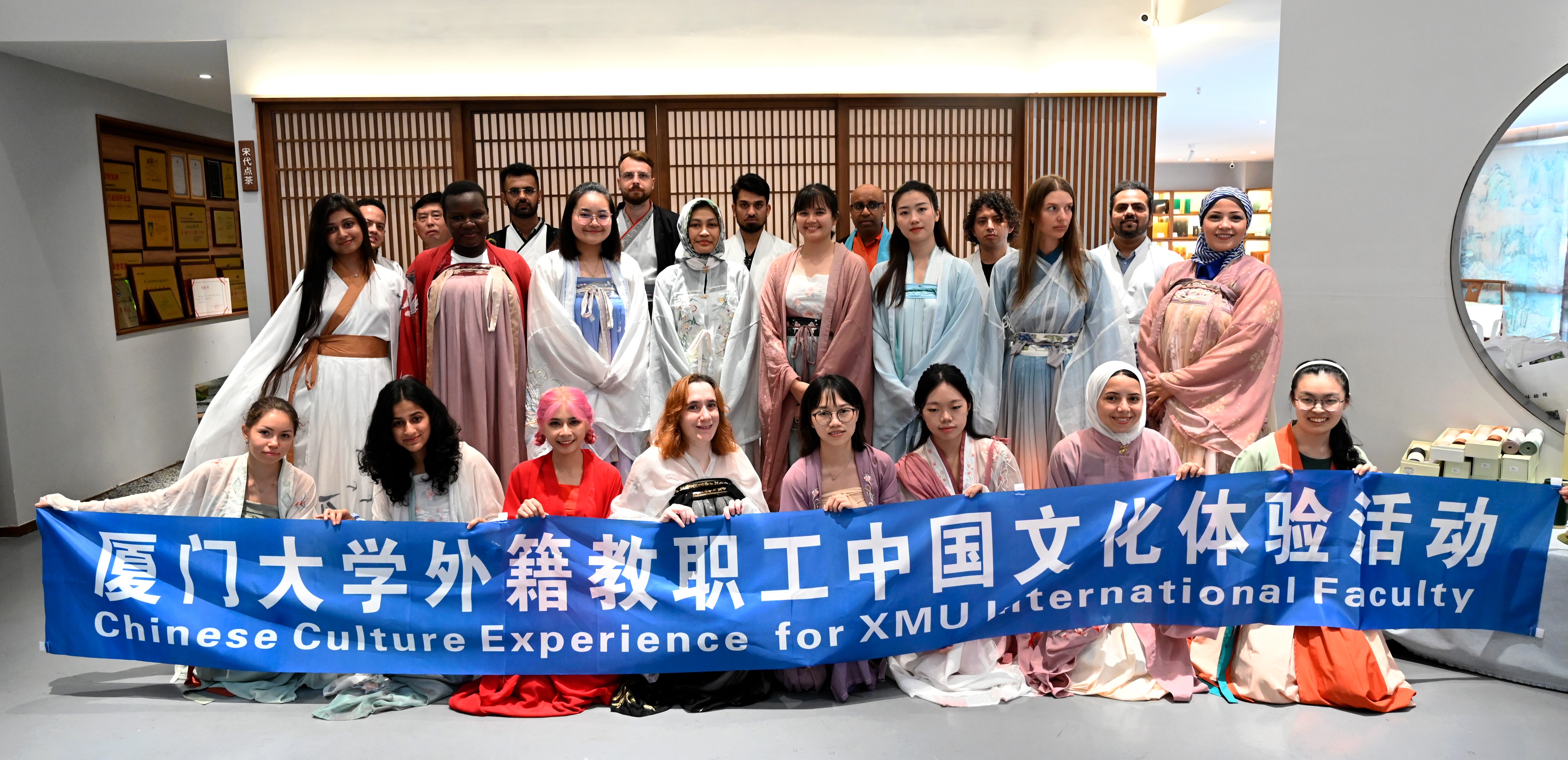 为进一步加强我校外籍师生的沟通交流,增进外籍师生对中国传统文化的认同与喜爱,国际处于7月16日组织近三十位外籍师生体验汉服文化和茶道艺术。