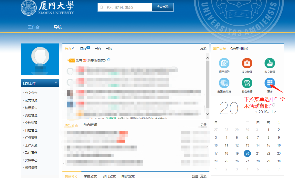 2. 在“更多”的下拉菜单中,选中“学术活动审批”;