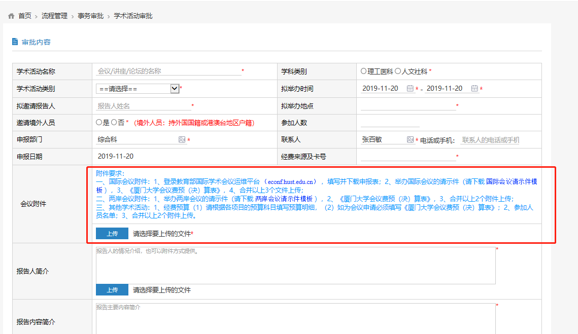 注意事项:两岸会议开始在校内OA学术活动审批版块申请完成申报后,请同时将会议申报表的word电子版及其它会议要求材料发送给国际处/台港澳办,申请人请及时留意会议审批的进度,拿到教育部同意批复的批件,会议方能召开,否则违规。台港澳办经办人:李怡楠,办公电话:2185321,邮箱:liyinan@xmu.edu.cn 。