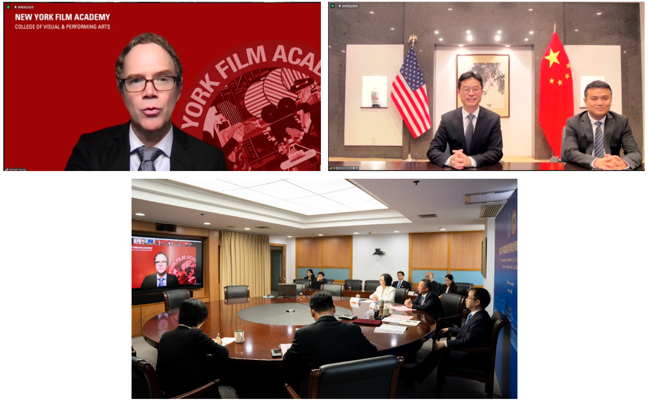 Michael Young介绍了纽约电影学院在课程教学、师生实践训练、与中国高校交流合作情况。他表示,两校合作备忘录的签署具有重要里程碑意义,推动了电影领域高等教育国际化进程,也将为中国留学生提供更多的学习实践机会,增进中美两国人民了解互信。希望双方不断拓展合作的深度广度,携手并进、共赢发展。