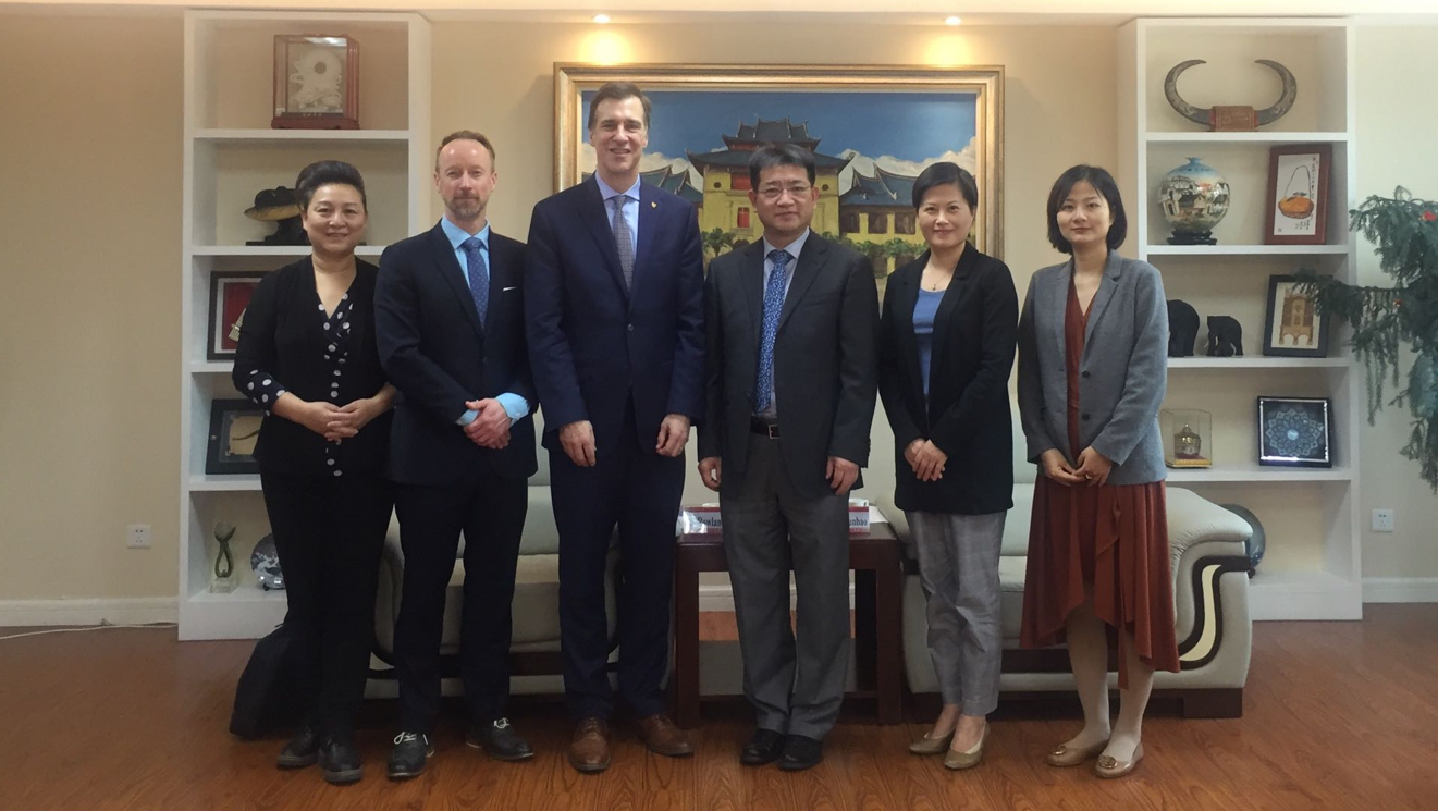 11月29日,加拿大滑铁卢大学助理副校长Ian Rowlands, 旅游管理系系主任Troy Daniel Glover,国际处中国特别顾问赵素萍一行访问我校,副校长江云宝会见来宾,国际合作与交流处副处长余宏波陪同会见。