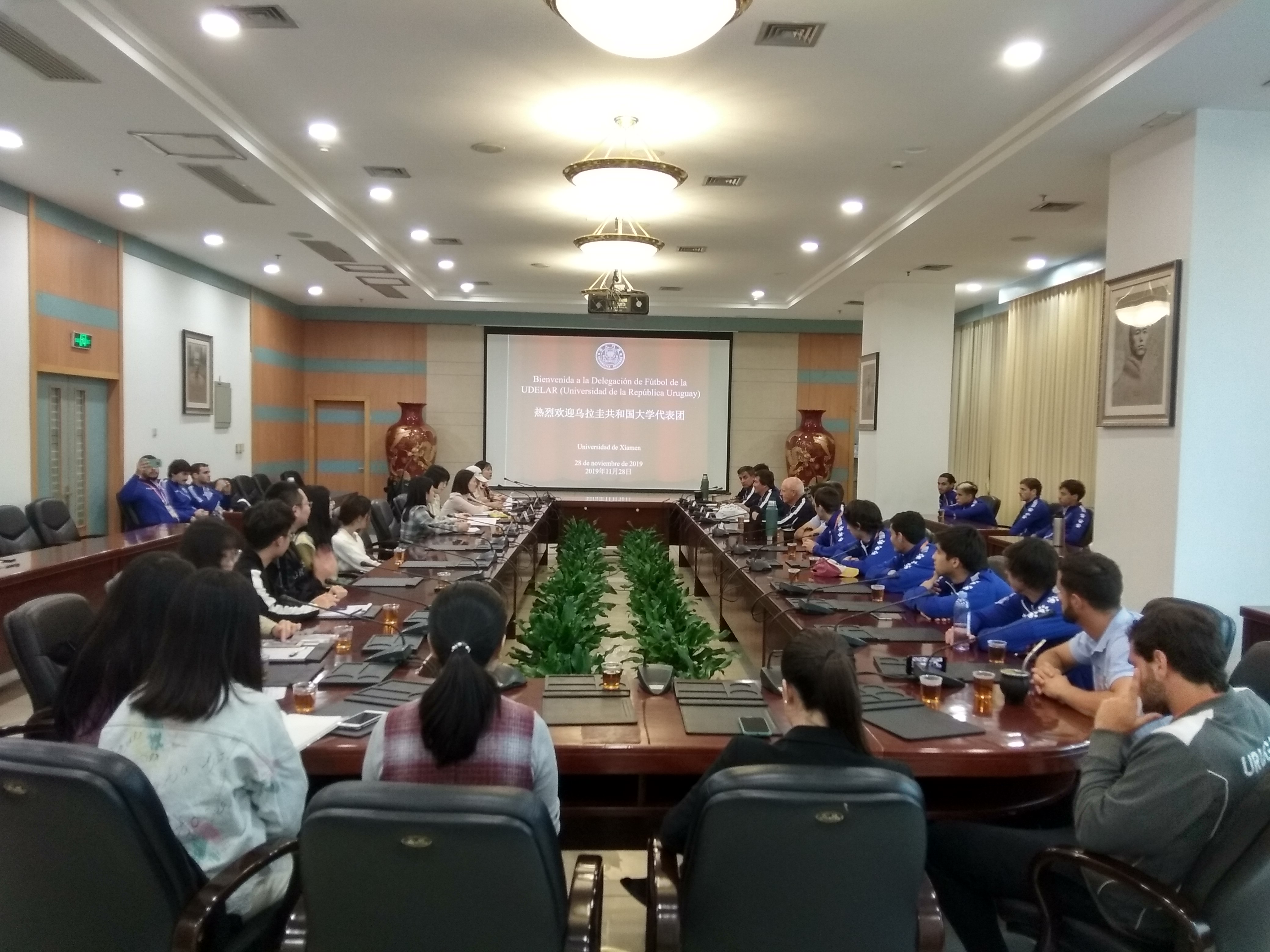 11月28日,乌拉圭共和国大学足球代表团一行28人来访我校,我校体育教学部副主任吴飞腾、外文学院西班牙语系负责人张雅惠、西班牙语系教师孙敏、招生办国际招生办公室李玉婷出席会谈,10名西班牙语系本科生参加会谈。国际处主持会议。